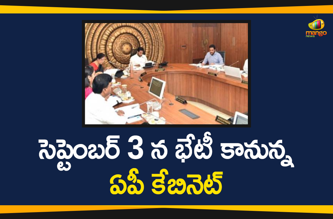 ఆంధ్రప్రదేశ్ ముఖ్యమంత్రి వైఎస్ జగన్ మోహన్ రెడ్డి అధ్యక్షతన సెప్టెంబర్ 3, గురువారం ఉదయం 11 గంటలకు వెలగపూడిలోని సచివాలయంలో రాష్ట్ర మంత్రివర్గ సమావేశం జరగనుంది. ఈ సమావేశంలో రాష్ట్రంలో సంక్షేమ, అభివృద్ధి కార్యక్రమాలకు సంబంధించి పలు కీలక నిర్ణయాలు తీసుకోనున్నారు. కాగా గత కేబినెట్ సమావేశం ఆగస్టు 19 న జరగగా, వైఎస్ఆర్ ఆసరా పథకం, వైఎస్ఆర్ సంపూర్ణ పోషణ పథకం, వైఎస్ఆర్ విద్యాకానుక పథకం, ఇంటింటికి నాణ్యమైన బియ్యం పంపిణీ ప్రారంభాలపై చర్చించి ఆమోదం తెలిపారు. అలాగే నూతన పారిశ్రామిక విధానం, డివిజనల్ డెవలప్మెంట్ అధికారుల పోస్టుల భర్తీకి కూడా ఆమోదం తెలిపారు.