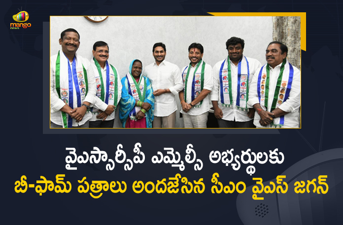 ఆంధ్రప్రదేశ్ రాష్ట్రంలో ఎమ్మెల్యే కోటాకు సంబంధించిన జరగనున్న ఆరు ఎమ్మెల్సీ స్థానాల ఎన్నికలకు వైఎస్ఆర్ కాంగ్రెస్ పార్టీ ఇటీవలే తమ అభ్యర్థుల పేర్లను ప్రకటించిన సంగతి తెలిసిందే. ఆరు స్థానాలకు గానూ చల్లా భగీరథరెడ్డి, బల్లి కళ్యాణ్ చక్రవర్తి, సి.రామచంద్రయ్య, షేక్ మహ్మద్ ఇక్బాల్, దువ్వాడ శ్రీనివాస్, కరీమున్నీసా లను పార్టీ తరుపున ఎంపిక చేశారు. ఈ నేపథ్యంలో ఆరుగురు వైఎస్సార్సీపీ ఎమ్మెల్సీ అభ్యర్థులు గురువారం నాడు క్యాంప్ కార్యాలయంలో పార్టీ అధినేత, ముఖ్యమంత్రి వైఎస్ జగన్ మోహన్ రెడ్డి ని కలిశారు. ఈ సందర్భంగా సీఎం వైఎస్ జగన్ వారికీ బీ-ఫామ్ పత్రాలను అందజేశారు. ఈ ఆరుగురు ఎమ్మెల్సీ అభ్యర్థులు గురువారం నాడు నామినేషన్లు దాఖలు చేయనున్నారు.