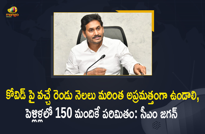 ఆంధ్రప్రదేశ్ ముఖ్యమంత్రి వైఎస్ జగన్ మోహన్ రెడ్డి సోమవారం నాడు కోవిడ్–19 నివారణ, నియంత్రణ, వ్యాక్సినేషన్, వైద్య ఆరోగ్యశాఖలో నాడు–నేడుపై తాడేపల్లిలోని క్యాంప్ కార్యాలయంలో సమీక్ష నిర్వహించారు. ఈ సందర్భంగా వచ్చే రెండు నెలలపాటు మరింత అప్రమత్తంగా ఉండాలని అధికారులకు సీఎం జగన్ కీలక ఆదేశాలు జారీ చేశారు. కోవిడ్ ప్రోటోకాల్స్ను తప్పనిసరిగా పాటించేలా చూడాలని, రాష్ట్రంలో ఎక్కడా కూడా పెద్ద ఎత్తున జనం గుమిగూడకుండా చూడాలన్నారు. పెళ్లిళ్ల సీజన్లో పెద్ద ఎత్తున ప్రజలు ఒక చోటకు వచ్చే అవకాశముందని, పెళ్లిళ్లకు హాజరయ్యే వారి సంఖ్య 150 మందికే పరిమితం చేయాలని సీఎం ఆదేశాలు ఇచ్చారు. అలాగే ఇతర ఊరేగింపులు, మతపరమైన కార్యక్రమాల్లో కూడా ఎక్కువమంది గుమిగూడకుండా చూడాలన్నారు. అన్ని చోట్లా తప్పకుండా మాస్కులు వేసుకునేలా, భౌతిక దూరం పాటించేలా చర్యలు తీసుకోవాలని సూచించారు.