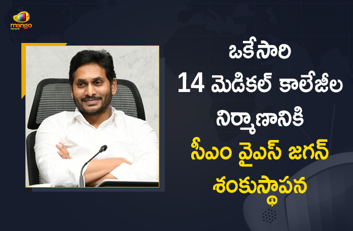 ఆంధ్రప్రదేశ్ ముఖ్యమంత్రి వైఎస్ జగన్ మోహన్ రెడ్డి సోమవారం నాడు రాష్ట్రంలో కొత్తగా ఏర్పాటు చేస్తున్న 14 మెడికల్ కాలేజీల నిర్మాణానికి ఒకేసారి శంకుస్థాపన చేశారు. తాడేపల్లిలో క్యాంప్ కార్యాలయం నుంచి సీఎం వైఎస్ జగన్ చేతుల మీదుగా వర్చువల్ గా ఈ కార్యక్రమం జరిగింది. రాజమండ్రి, పాలకొల్లు, అమలాపురం, ఏలూరు, మచిలీపట్నం, బాపట్ల, మార్కాపురం, పిడుగురాళ్ల, విజయనగరం, అనకాపల్లి, మదనపల్లె, పెనుకొండ, అదోని, నంద్యాలలో ఏర్పాటు చేస్తున్న మెడికల్ కాలేజీలకు సీఎం వైఎస్ జగన్ శంకుస్థాపన చేశారు.