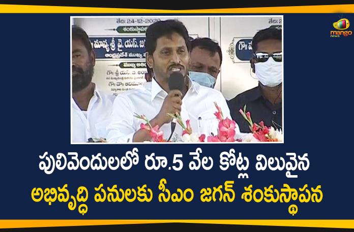 ఆంధ్రప్రదేశ్ ముఖ్యమంత్రి వైఎస్ జగన్ మోహన్ రెడ్డి కడప జిల్లాలో పర్యటిస్తున్న సంగతి తెలిసిందే. ఈ పర్యటనలో భాగంగా గురువారం నాడు పులివెందులలో రూ.5 వేల కోట్ల విలువైన పలు అభివృద్ధి కార్యక్రమాలకు సీఎం వైఎస్ జగన్ శంకుస్థాపన చేశారు. ఏపీఎస్ఆర్టీసీ బస్టాండు, డిపో నిర్మాణాలకు శంకుస్థాపన చేశారు. అలాగే బాలికల రెసిడెన్షియల్ పాఠశాలకు, పులివెందుల ఏరియా డెవలప్మెంట్ అథారిటీ పరిధిలో చేపట్టిన కొత్త బీటీ రోడ్లకు సీఎం శంకుస్థాపన నిర్వహించారు. గండి ఆంజనేయస్వామి క్షేత్రంలో అభివృద్ధి పనులకు, గండికోట-సీబీఆర్, గండికోట-పైడిపాలెం లిఫ్ట్ స్కీం, ఏపీ క్లార్ భవన నిర్మాణం, అపాచీ లెదర్ డెవలప్మెంట్ పార్కు, 4 మోడల్ పోలీస్ స్టేషన్ భవనాల నిర్మాణాలకు సహా పలు అభివృద్ధి కార్యక్రమాలకు సీఎం వైఎస్ జగన్ శంకుస్థాపన చేశారు.