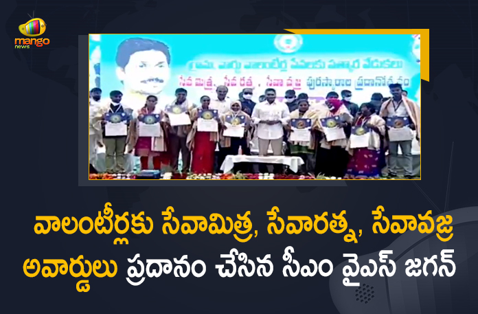 సేవా మిత్ర, సేవా రత్న, సేవా వజ్ర కేటగిరీల కింద మొత్తం 2,22,525 మంది వాలంటీర్లను సత్కారం చేయబోతున్నామని చెప్పారు. సత్కారంతో పాటుగా సేవామిత్ర పురస్కారం కింద రూ.10 వేల నగదు బహుమతి, సేవారత్న పురస్కారం కింద రూ.20 వేల చొప్పున నగదు బహుమతి, సేవా వజ్రం పురస్కారం కింద రూ.30 వేల చొప్పున నగదు పురస్కారాన్ని అందజేయనున్నామని, ఈ పురస్కారాలకు ప్రభుత్వం 240 కోట్లు ఖర్చు చేస్తుందని చెప్పారు. వాలంటీర్లకు ఈ పురస్కారాలను ప్రతి సంవత్సరం అందిస్తామన్నారు. నిస్వార్ధంగా సేవలు చేస్తున్న వాలంటీర్ల అందరికి సెల్యూట్ చేస్తున్నానని సీఎం వైఎస్ జగన్ పేర్కొన్నారు.