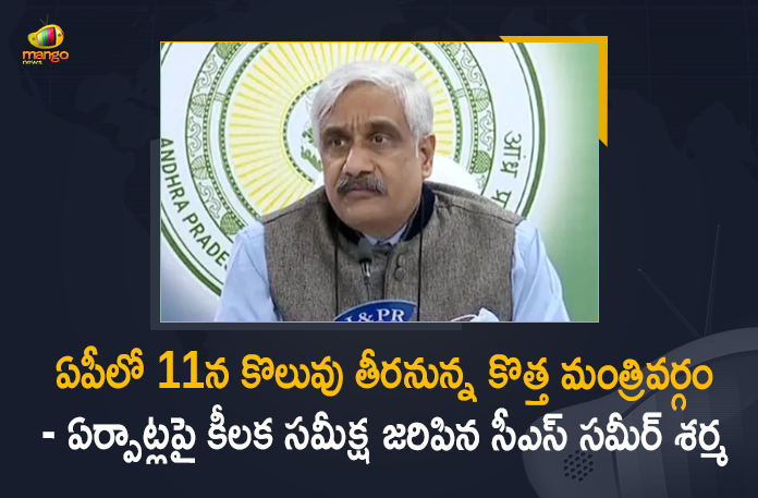 ఆంధ్రప్రదేశ్లో ఈ నెల 11వ తేదీన జరగనున్న నూతన మంత్రుల ప్రమాణ స్వీకార కార్యక్రమానికి పకడ్బందీ ఏర్పాట్లు చేయాలని ప్రభుత్వ ప్రధాన కార్యదర్శి డా. సమీర్ శర్మ ఆదేశించారు. ఈ మేరకు శుక్రవారం ఆయన నూతన మంత్రుల ప్రమాణ స్వీకార కార్యక్రమం ఏర్పాట్లపై వీడియో సమావేశం ద్వారా సంబంధిత శాఖల అధికారులతో సమీక్షించారు. ఈ సందర్భంగా సీఎస్ మాట్లాడుతూ.. మొత్తం 20 మంది వరకు కొత్త మంత్రులు ఉండొచ్చని, ప్రమాణస్వీకార సమయంలో ఏదేని అవసరం కోసం వారికి అందుబాటులో ఉండాలని సూచించారు. అలాగే ప్రమాణ స్వీకార కార్యక్రమానికి తగిన ఏర్పాట్లు చేయాలని, అదే సమయంలో బందోబస్తు ఏర్పాట్లు కూడా పటిష్టంగా ఉండాలని సంబంధిత శాఖల కార్యదర్శులను, పోలీస్ శాఖ ఉన్నతాధికారులను ఆదేశించారు. నిబంధనల ప్రకారం నూతన మంత్రి వర్గ సభ్యుల ప్రమాణ స్వీకార కార్యక్రమం చేపట్టాలని అధికారులను సీఎస్ ఆదేశించారు. ఈ సమావేశంలో డీఐజీలు సి.త్రివిక్రమ వర్మ, రాజశేఖర్ పాల్గొన్నారు. అలాగే వీడియో సమావేశం ద్వారా గుంటూరు కలెక్టర్ ఎం.వేణుగోపాల్ రెడ్డి, ప్రోటోకాల్ డైరెక్టర్ సుబ్రహ్మణ్యం రెడ్డి, పలు శాఖల అధికారులు పాల్గొన్నారు.