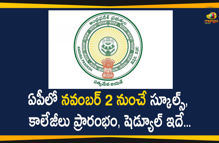 ఆంధ్రప్రదేశ్ రాష్ట్రంలో నవంబర్ 2 వ తేదీ నుంచి పాఠశాలలు ప్రారంభించాలని నిర్ణయించినట్లు ఇటీవల ముఖ్యమంత్రి వైఎస్ జగన్ మోహన్ రెడ్డి ప్రకటించిన సంగతి తెలిసిందే. ఈ నేపథ్యంలో కరోనా వ్యాప్తిపై అన్ని జాగ్రత్తలు తీసుకుంటూ, పాఠశాలలను మూడు దశల్లో ప్రారంభించేందుకు అధికారులు ఏర్పాట్లు చేస్తున్నారు. విద్యార్థులకు రోజు విడిచి రోజు తరగతులు నిర్వహించనున్నారు. ఈ మేరకు పాఠశాలలు ప్రారంభం, తరగతుల నిర్వహణకు సంబంధించిన షెడ్యూల్ ను ఏపీ రాష్ట్ర ప్రభుత్వ ప్రధాన కార్యదర్శి నీలం సాహ్ని గురువారం నాడు విడుదల చేశారు. రాష్ట్రంలో అన్ని ప్రభుత్వ మరియు ప్రైవేట్ విద్యా సంస్థలు ఇదే షెడ్యూల్ పాటించాలని సూచించారు.