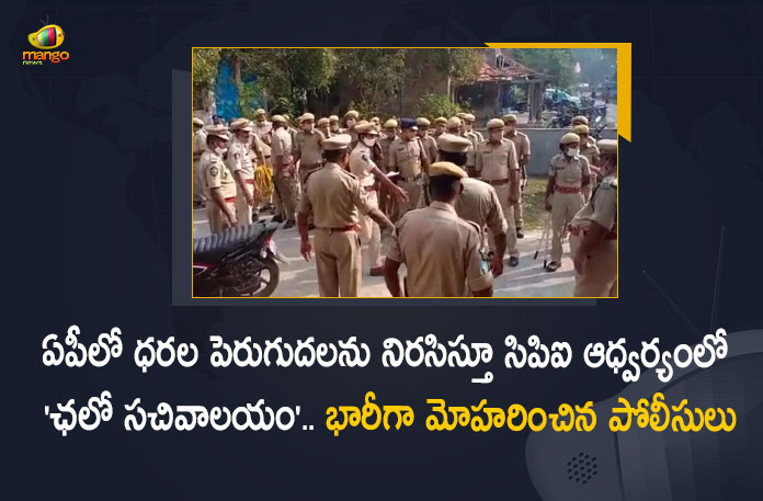 ఆంధ్రప్రదేశ్ రాష్ట్రంలో ధరల పెరుగుదలను నిరసిస్తూ ‘ఛలో సచివాలయం’ కార్యక్రమానికి సీపీఐ పిలుపునిచ్చింది. ఈ నేపథ్యంలో.. ఏపీ పోలీసులు అప్రమత్తమయ్యారు. ఏపీ సచివాలయం వద్ద భారీగా పోలీసులు మోహరించారు. ‘ఛలో సచివాలయం’ కార్యక్రమానికి అనుమతి లేదని పోలీసులు స్పష్టం చేశారు. అయితే సచివాలయం ముట్టడికి సీపీఐ నేతలు సిద్దపడుతున్నారు. ఈ క్రమంలో సచివాలయం వద్దకు వెళ్లే క్రమంలో సీపీఐ కార్యకర్తలు, ఆ పార్టీ రాష్ట్ర కార్యాలయం దాసరి భవన్ వద్దకు పెద్ద సంఖ్యలో చేరుకోవడంతో అక్కడ ఉద్రిక్త వాతావరణం నెలకొంది.