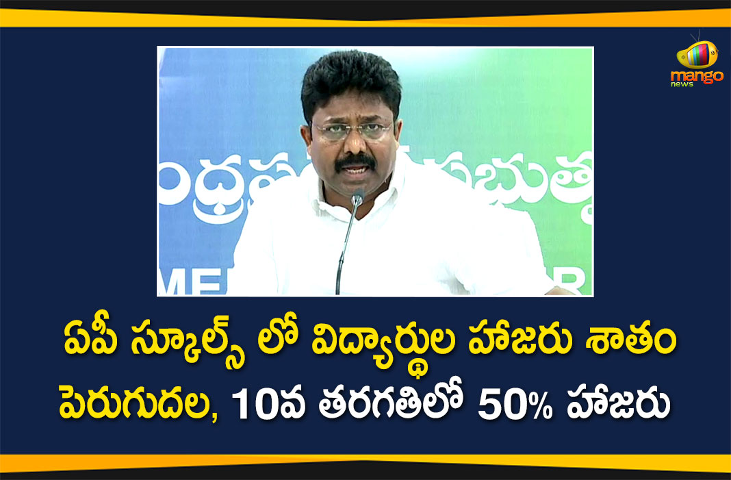ఆంధ్రప్రదేశ్ రాష్ట్రంలో నవంబర్ 2 వ తేదీ నుంచి పాఠశాలలు ప్రారంభమైన సంగతి తెలిసిందే. ముందుగా మొదటి దశలో భాగంగా నవంబర్ 2 వ తేదీ నుంచి 9,10, ఇంటర్ మొదటి, రెండో సంవత్సరం విద్యార్థులకు తరగతులును రోజు విడిచి రోజు నిర్వహిస్తున్నారు. ఈ నేపథ్యంలో విద్యాశాఖ మంత్రి ఆదిమూలపు సురేష్ మాట్లాడుతూ, రాష్ట్రంలోని ప్రభుత్వ పాఠశాలల్లో రోజురోజుకు విద్యార్థుల హాజరు శాతం పెరుగుతోందని వెల్లడించారు. నవంబర్ 2 న 42% విద్యార్థులు హాజరు కాగా, 3న 33.69%, 4న 40.30%, 5న 35%, 6 వ 43.89 శాతం విద్యార్థులు పాఠశాలలకు హాజరయినట్టు తెలిపారు. ముఖ్యంగా 10 వ తరగతి విద్యార్థులు హాజరు క్రమంగా పెరుగుతుందని, 6 వ తేదీ నాటికీ 10వ తరగతిలో 49.63 శాతం మంది విద్యార్థులు హాజరయినట్టు తెలిపారు.