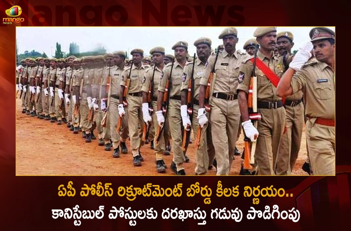 ఆంధ్రప్రదేశ్ పోలీస్ రిక్రూట్మెంట్ బోర్డు కీలక నిర్ణయం తీసుకుంది. కానిస్టేబుల్ పోస్టులకు దరఖాస్తు గడువు పొడిగించింది. కాగా ముఖ్యమంత్రి వైఎస్ జగన్ మోహన్ రెడ్డి ఆదేశాల మేరకు ఇటీవలే కానిస్టేబుల్ పోస్టులకు దరఖాస్తు చేసుకునే అభ్యర్థులకు వయోపరిమితి రెండేళ్లు సడలించిన విషయం తెలిసిందే. ఈ నేపథ్యంలో తాజాగా అర్హత సాధించిన అభ్యర్థులు ఆన్లైన్లో దరఖాస్తు చేసుకునేందుకు వీలుగా గడువును 2023 జనవరి 7 వరకు పొడిగించింది. ఈ మేరకు రిక్రూట్మెంట్ బోర్డు పొలీసు నియామక నోటిఫికేషన్ సవరించింది. అంతకుముందు విడుదల చేసిన నోటిఫికేషన్ ప్రకారం, దరఖాస్తు గడువు డిసెంబర్ 28 వరకూ ఉంది. అయితే తాజా సవరణతో అభ్యర్థులకు నేటినుంచి మరో 10రోజుల సమయం లభించినట్లయింది. దీంతో ఏపీ పోలీస్ రిక్రూట్మెంట్ బోర్డు నిర్ణయంపై ఉద్యోగార్థులు హర్షం వ్యక్తం చేస్తున్నారు. ఇక రాష్ట్రంలో మొత్తం 611 ఎసై పోస్టులు, 6,100 కానిస్టేబుల్ పోస్టులను భర్తీ చేయనున్నారు.