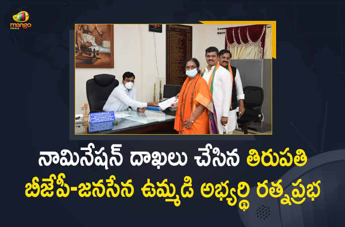 తిరుపతి లోక్సభ ఉపఎన్నికలో బీజేపీ-జనసేన ఉమ్మడి అభ్యర్థిగా మాజీ ఐఏఎస్ అధికారిణి రత్నప్రభ పోటీచేస్తున్న సంగతి తెలిసిందే. ఈ నేపథ్యంలో సోమవారం నాడు ఇరుపార్టీల కార్యకర్తలు, నాయకులతో కలిసి ర్యాలీగా వెళ్లి ఆమె నామినేషన్ దాఖలు చేశారు. నెల్లూరు కలెక్టరేట్ లో రిటర్నింగ్ ఆఫీసర్, కలెక్టర్ చక్రధర్ బాబుకు నామినేషన్ పత్రాలు అందజేశారు. రత్నప్రభ నామినేషన్ కార్యక్రమంలో బీజేపీ రాజ్యసభ ఎంపీలు జివీఎల్ నర్సింహారావు, సీఎం రమేష్, బీజేపీ నేత ఆదినారాయణ రెడ్డి, తదితరులు పాల్గొన్నారు. తిరుపతిలో వైఎస్సార్సీపీ, టీడీపీ, బీజేపీ వంటి ప్రధాన పార్టీల అభ్యర్థులు నామినేషన్స్ దాఖలు చేయడం పూర్తవడంతో ప్రచార పర్వం ఊపందుకుంది. గెలుపే లక్ష్యంగా పలువురు నాయకులు తమ పార్టీ అభ్యర్థుల తరపున తిరుపతి లోక్సభ నియోజకవర్గ పరిధిలో ముమ్మరంగా ప్రచారం నిర్వహిస్తున్నారు.