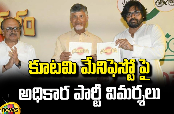 తెలుగుదేశం పార్టీ అధినేత నారా చంద్రబాబు నాయుడు, జనసేన అధినేత పవన్ కళ్యాణ్ కలిసి మే 30న మేనిఫెస్టోను రిలీజ్ చేయడం ఆలస్యం.. అధికారపార్టీ దానిలోని లోటుపాట్లపై బూతద్ధం తీసుకుని రెడీ అయిపోయింది. మేనిఫెస్టోలో బీజేపీ పాత్ర ఎందుకు లేదు..? బీజేపీ ఫోటోలు ఎందుకు లేవంటూ ప్రశ్నల వర్షం కురిపించింది.