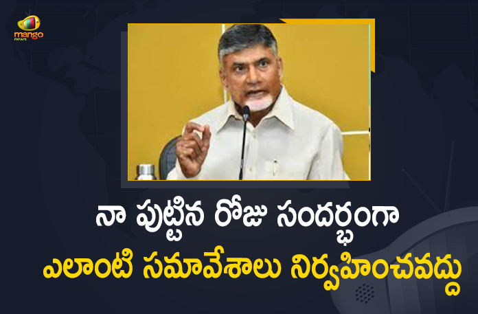 ప్రస్తుత కరోనా పరిస్థితుల దృష్ట్యా ఏప్రిల్ 20న తన పుట్టినరోజు సందర్భంగా ఎలాంటి సమావేశాలు నిర్వహించవద్దని టీడీపీ జాతీయ అధ్యక్షుడు, మాజీ ముఖ్యమంత్రి చంద్రబాబు నాయుడు పార్టీ నాయకులు, కార్యకర్తలకు సూచించారు. ఈ మేరకు ఆయన ట్వీట్ చేశారు. “నా పుట్టినరోజుకు ఒక ప్రత్యేకతను తీసుకురావడానికి మీరంతా చేపట్టే కార్యక్రమాలు అభినందనీయం. అందుకు మీ అందరికీ కృతజ్ఞతలు. అయితే ఇప్పుడు కోవిడ్-19 నుంచి రక్షణ పొందడం చాలా అవసరం. అందుకే నా పుట్టిన రోజు సందర్భంగా ఎలాంటి సమావేశాలు నిర్వహించవద్దని తెలుగుదేశం పార్టీ నేతలను, కార్యకర్తలను కోరుతున్నాను. దయచేసి మీరంతా ఒకరికొకరు భౌతిక దూరం పాటిస్తూ సురక్షితంగా ఉండండి. మీ అందరి క్షేమమే మీరు నాకిచ్చే జన్మదిన కానుక” అని చంద్రబాబు పేర్కొన్నారు.