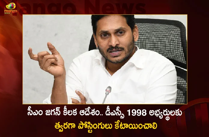 ఆంధ్రప్రదేశ్ ముఖ్యమంత్రి వైఎస్ జగన్ మోహన్ రెడ్డి కీలక ఆదేశాలు జారీ చేశారు. డీఎస్సీ 1998 అభ్యర్థులకు త్వరగా పోస్టింగులు కేటాయించాల్సిందిగా అధికారులకు సూచించారు. ఈమేరకు ఆయన గురువారం పాఠశాల విద్యాశాఖపై సమీక్ష నిర్వహించారు. తాడేపల్లిలోని సీఎం క్యాంపు కార్యాలయంలో జరిగిన ఈ సమావేశానికి విద్యాశాఖ మంత్రి బొత్స సత్యనారాయణ, గ్రామ, వార్డు సచివాలయాల స్పెషల్ సీఎస్ అజయ్ జైన్, పాఠశాల విద్యాశాఖ ముఖ్య కార్యదర్శి ప్రవీణ్ ప్రకాష్ సహా పలువురు విద్యాశాఖ అధికారులు హాజరయ్యారు. ఈ సందర్భంగా సీఎం జగన్ అధికారులకు పలు కీలక ఆదేశాలు జారీ చేశారు.