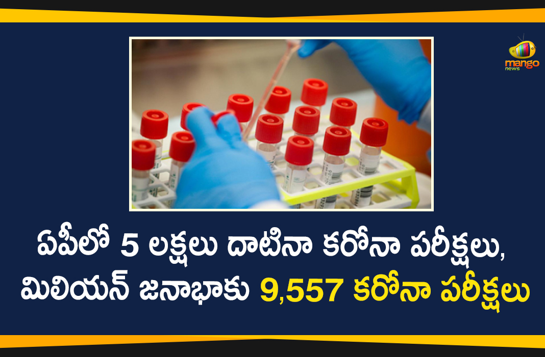 ఆంధ్రప్రదేశ్ రాష్ట్రంలో కరోనా వైరస్ వ్యాప్తి నివారణకు రాష్ట్ర ప్రభుత్వం కట్టుదిట్టమైన చర్యలు తీసుకుంటుంది. ఈ నేపథ్యంలో కరోనా పరీక్షల నిర్వహణలో భాగంగా ఆంధ్రప్రదేశ్ రికార్డు స్థాయిలో 5 లక్షలకు పైగా పరీక్షలను నిర్వహించింది. ఇప్పటివరకు 5,10,318 సాంపిల్స్ కి కరోనా పరీక్షలు చేసి దేశంలోనే మొదటిస్థానంలో నిలిచింది. ప్రతి పది లక్షల (మిలియన్) జనాభాకు 9,557 మందికి కరోనా వైద్య పరీక్షలు నిర్వహించారు. ఇక ఏపీలో కరోనా వైరస్ నుంచి సంపూర్ణంగా కోలుకుని డిశ్చార్జ్ అయ్యే వారి సంఖ్య 54.67 శాతానికి పెరిగింది.