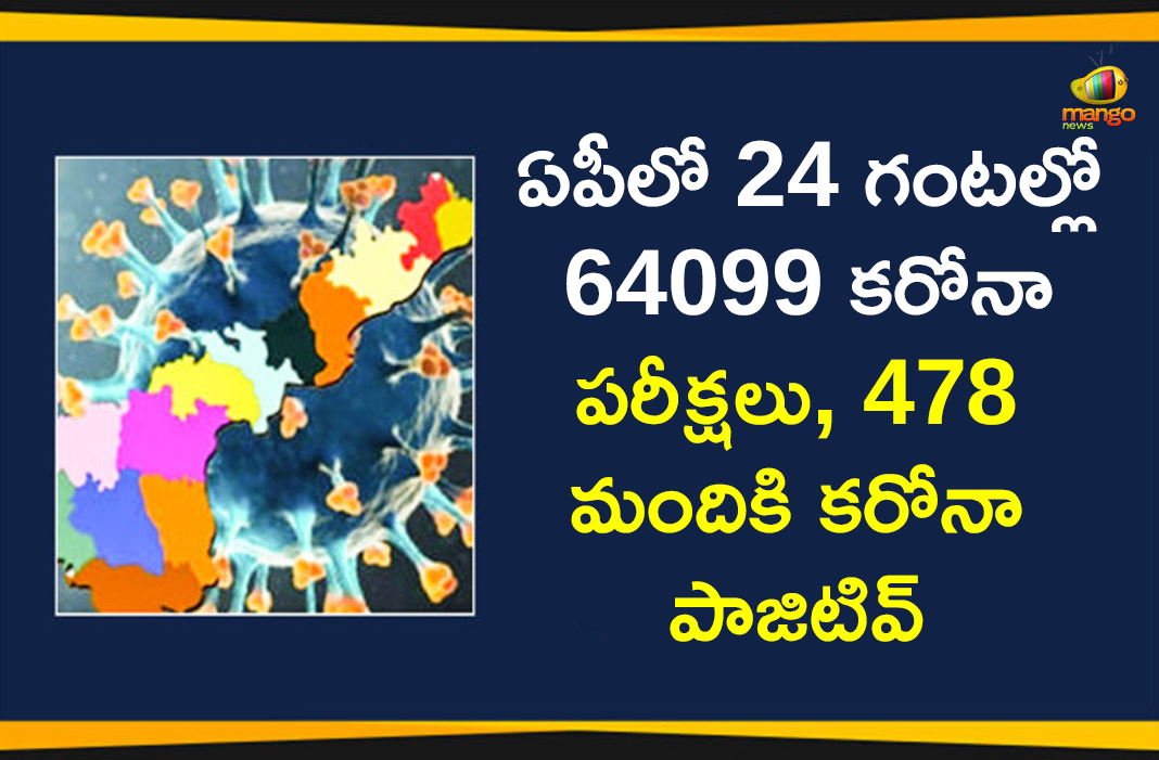ఆంధ్రప్రదేశ్ లో కరోనా వ్యాప్తి తగ్గుముఖం పట్టింది. బుధవారం ఉదయం 10 గంటల వరకు రాష్ట్రంలో మొత్తం కరోనా పాజిటివ్ కేసుల సంఖ్య 8,76,814 కు చేరుకుంది. గత 24 గంటల్లో 64099 శాంపిల్స్ కి పరీక్షలు నిర్వహించగా, 478 మందికి కరోనా పాజిటివ్ గా నిర్ధారణ అయినట్టు తెలిపారు. కొత్తగా తూర్పుగోదావరి జిల్లాలో 58, కర్నూల్ జిల్లాలో 6, కృష్ణా జిల్లాలో 62, కడప జిల్లాలో 19, గుంటూరు జిల్లాలో 48, చిత్తూరు జిల్లాలో 89, అనంతపూర్ జిల్లాలో 30, నెల్లూరు జిల్లాలో 17, ప్రకాశం జిల్లాలో 12, శ్రీకాకుళంలో 13, విశాఖపట్నంలో 44, విజయనగరంలో 17, పశ్చిమగోదావరిలో 63 కేసులు నమోదయ్యాయి.
