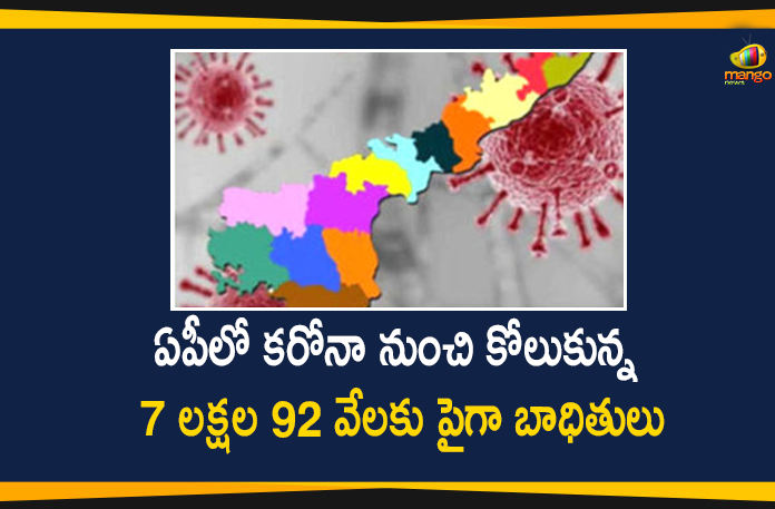 ఆంధ్రప్రదేశ్ రాష్ట్రంలో కరోనా నుంచి కోలుకున్న వారి సంఖ్య 7 లక్షల 92 వేలు దాటింది. కొత్తగా 3708 మంది కరోనా నుంచి కోలుకుని సంపూర్ణ ఆరోగ్యంతో డిశ్చార్జ్ కావడంతో కోలుకున్న వారి మొత్తం సంఖ్య 7,92,083 కు చేరుకుంది. రాష్ట్రంలో మరో 2783 పాజిటివ్ కేసులు నమోదవడంతో అక్టోబర్ 31, శనివారం ఉదయం 10 గంటల నాటికీ మొత్తం కేసుల సంఖ్య 8,23,348 కు చేరుకున్నట్టు ప్రకటించారు. మొత్తం కేసుల్లో 8,20,453 రాష్ట్రంలో నమోదుకాగా, ఇతర రాష్ట్రాల నుంచి వచ్చిన వారు మరియు విదేశాల నుండి వచ్చిన వారు 2895 మంది ఉన్నారు. అలాగే కరోనా మరణాల సంఖ్య కూడా 6690 కి చేరింది. ప్రస్తుతం 24575 మంది చికిత్స పొందుతున్నారు.