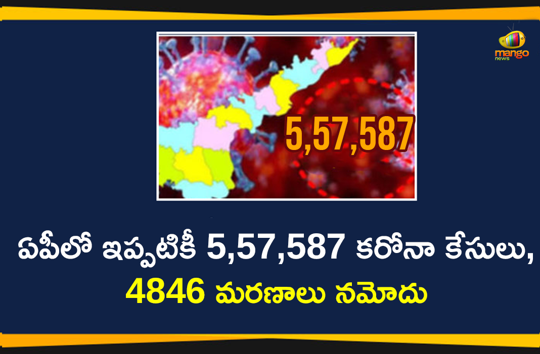 ఆంధ్రప్రదేశ్ రాష్ట్రంలో కరోనా పాజిటివ్ కేసుల సంఖ్య 5 లక్షల 57 వేలు దాటింది. కొత్తగా 9901 కేసులు నమోదవడంతో సెప్టెంబర్ 12, శనివారం ఉదయం 10 గంటల నాటికీ మొత్తం కేసుల సంఖ్య 5,57,587 కు చేరుకున్నట్టు ప్రకటించారు. మొత్తం కేసుల్లో 5,54,692 రాష్ట్రంలో నమోదుకాగా, ఇతర రాష్ట్రాల నుంచి వచ్చిన వారు మరియు విదేశాల నుండి వచ్చిన వారు 2895 మంది ఉన్నారు. అలాగే కరోనా మరణాల సంఖ్య కూడా 4846 కి చేరింది. ఇప్పటికి 4,57,008 మంది కోలుకుని సంపూర్ణ ఆరోగ్యంతో డిశ్చార్జ్ చేయబడగా, ప్రస్తుతం ఆసుపత్రుల్లో మరియు కోవిడ్ కేర్ సెంటర్స్ లో కలిపి మొత్తం 95733 మంది చికిత్స పొందుతున్నారు.