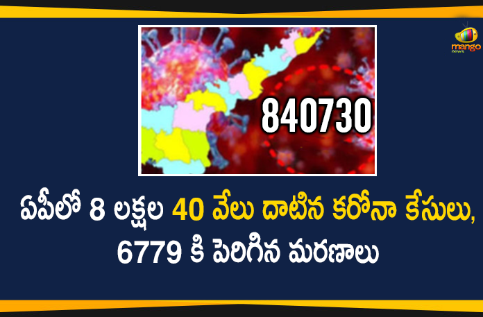 ఆంధ్రప్రదేశ్ రాష్ట్రంలో కరోనా పాజిటివ్ కేసుల సంఖ్య 8 లక్షల 40 వేలు దాటింది. కొత్తగా 2367 కేసులు నమోదవడంతో నవంబర్ 7, శనివారం ఉదయం 10 గంటల నాటికీ మొత్తం కేసుల సంఖ్య 8,40,730 కు చేరుకున్నట్టు ప్రకటించారు. మొత్తం కేసుల్లో 8,37,835 రాష్ట్రంలో నమోదుకాగా, ఇతర రాష్ట్రాల నుంచి వచ్చిన వారు మరియు విదేశాల నుండి వచ్చిన వారు 2895 మంది ఉన్నారు. అలాగే కరోనా మరణాల సంఖ్య కూడా 6779 కి చేరింది. ఇప్పటికి 8,12,517 మంది కోలుకుని సంపూర్ణ ఆరోగ్యంతో డిశ్చార్జ్ చేయబడగా, ప్రస్తుతం 21434 మంది చికిత్స పొందుతున్నారు.