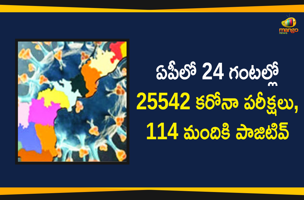 ఆంధ్రప్రదేశ్ రాష్ట్రంలో శనివారం ఉదయం 10 గంటల వరకు మొత్తం కరోనా పాజిటివ్ కేసుల సంఖ్య 8,85,824 కు చేరుకుంది. గత 24 గంటల్లో 25542 శాంపిల్స్ కి పరీక్షలు నిర్వహించగా 114 మందికి కరోనా పాజిటివ్ గా నిర్ధారణ అయినట్టు తెలిపారు. కొత్తగా తూర్పుగోదావరి జిల్లాలో 13, కర్నూల్ లో 8, కృష్ణాలో 12, కడపలో 2, గుంటూరులో 6, చిత్తూరులో 24, అనంతపూర్ లో 3, నెల్లూరులో 10, ప్రకాశంలో 1, శ్రీకాకుళంలో 6, విశాఖపట్నంలో 22, విజయనగరంలో 3, పశ్చిమగోదావరిలో 4 కేసులు నమోదయ్యాయి.