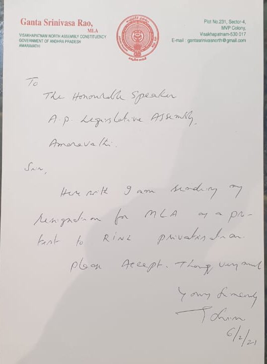 విశాఖపట్నం నార్త్ నియోజకవర్గ ఎమ్మెల్యే, టీడీపీ నేత గంటా శ్రీనివాసరావు తన పదవికి రాజీనామా చేస్తున్నట్టు ప్రకటించారు. విశాఖ ఉక్కు పరిశ్రమ ప్రైవేటీకరణ చేయాలని కేంద్రప్రభుత్వం తీసుకున్న నిర్ణయానికి నిరసనగా తన ఎమ్మెల్యే పదవికి రాజీనామా చేస్తునట్టు వెల్లడించారు. ఈ మేరకు తన రాజీనామా లేఖను శాసనసభ స్పీకర్‌ తమ్మినేని సీతారాంకు పంపినట్టు తెలిపారు. వైజాగ్ ఉక్కు పరిశ్రమ పరిరక్షణ కోసం కట్టుబడి ఉన్నానని, ఈ నేపథ్యంలోనే రాజీనామా చేస్తున్నట్టు గంటా తెలిపారు.