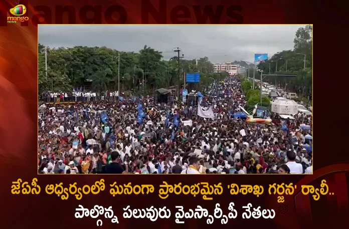 ఆంధ్రప్రదేశ్ రాష్ట్ర ప్రభుత్వ రాజధానుల వికేంద్రీకరణ అభివృద్ధి నినాదానికి అనుకూలంగా రాజకీయేతర జాయింట్ యాక్షన్ కమిటీ (జేఏసీ) సభ్యులు శనివారం నగరంలో ‘విశాఖ గర్జన‘ ర్యాలీ ప్రారంభించారు. దీనికి మద్దతుగా పలువురు వైఎస్సార్సీపీ నాయకులు.. ఎంపీలు, మంత్రులు, ఎమ్మెల్యేలు, ఎమ్మెల్సీలు పాల్గొని సంఘీభావం ప్రకటించారు. అలాగే ఈ ర్యాలీకి వైఎస్సార్సీపీ శ్రేణులతో పాటు ప్రజలు, విద్యార్థులు భారీగా హాజరయ్యారు. కాగా ఒకవైపు అమరావతిని రాష్ట్రానికి ఏకైక రాజధానిగా చేయాలని డిమాండ్ చేస్తూ రైతుల మహా పాదయాత్ర ఉత్తరాంధ్ర వైపు సాగుతున్న తరుణంలో.. మూడు రాజధానుల ప్రతిపాదనకు మద్దతుగా జేఏసీ సభ్యులు ఈ కౌంటర్ ర్యాలీ చేపట్టడం గమనార్హం. మంత్రి గుడివాడ అమరనాథ్, మాజీ మంత్రి ధర్మాన కృష్ణదాస్, టీటీడీ ఛైర్మన్ వైవీ సుబ్బారెడ్డి తదితరులు ర్యాలీలో పాల్గొన్నారు.