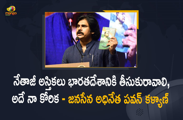 నేతాజీ అస్తికలు తిరిగి భారత దేశానికి తీసుకురావాలన్నదే తన కోరిక అని, అలాగే దేశాన్ని ప్రేమించే ప్రతి ఒక్కరి కోరిక అని జనసేన పార్టీ అధ్యక్షుడు పవన్ కళ్యాణ్ అన్నారు. గురువారం రాత్రి హైదరాబాద్ శిల్పకళా వేదికలో పవన్ కళ్యాణ్ లెర్నింగ్ సెంటర్ ఫర్ హ్యూమన్ ఎక్సిలెన్స్ ఆధ్వర్యంలో ఎం.వి.ఆర్.శాస్త్రి రాసిన నేతాజీ గ్రంధం సమీక్ష కార్యక్రమంలో పవన్ కళ్యాణ్ పాల్గొన్నారు. ఈ సందర్భంగా ఆయన మాట్లాడుతూ, జపాన్ దేశంలోని రెంకోజీ టెంపుల్ లో ఉండిపోయిన నేతాజీ అస్తికలు రెడ్ ఫోర్ట్ లో పెట్టాలని, దానిపై భారత మువ్వన్నెల జెండా ఎగరాలని డిమాండ్ చేశారు. అది చూసి ఆయన ఆత్మ శాంతించాలని, అది మనందరిలో నేతాజీ సుభాష్ చంద్రబోస్ స్పూర్తిని నింపాలని పవన్ కళ్యాణ్ అన్నారు.