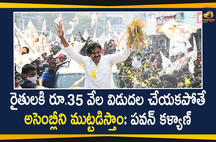 వచ్చే శాసన సభ సమావేశాల్లోగా నష్టపోయిన రైతులకి రూ.35 వేల పరిహారం అందించకపోతే జనసైనికులతో కలిసి అస్సెంబ్లీ ముట్టడికి పిలుపునిస్తాం – JanaSena Chief Sri @PawanKalyan#JSPStandsWithFarmers pic.twitter.com/gpWyO5wWsI