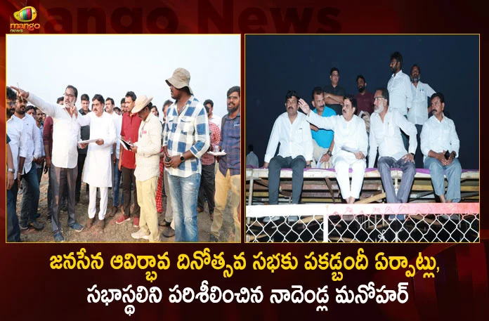 కృష్ణాజిల్లాలోని మచిలీపట్నం వేదికగా మార్చి 14వ తేదీన జనసేన పార్టీ 10వ ఆవిర్భావ దినోత్సవ సభ జరగనుంది. ఈ నేపథ్యంలో ఈ సభ ఏర్పాట్లను జనసేన పార్టీ రాజకీయ వ్యవహారాల కమిటీ చైర్మన్ నాదెండ్ల మనోహర్ శుక్రవారం సాయంత్రం పరిశీలించారు. ప్రధాన వేదిక, డీ జోన్, వీర మహిళలు, మీడియా కోసం ఏర్పాటు చేసిన గ్యాలరీలు పరిశీలించారు. సభకు హాజరయ్యే ఏ ఒక్కరికీ ఇబ్బంది లేకుండా చూడాలని నాయకులకి సూచించారు. పనులు ఎంత వరకు వచ్చిందనే విషయం పరిశీలించి, పార్టీ కార్యక్రమాల నిర్వహణ విభాగం ఛైర్మన్ కళ్యాణం శివశ్రీనివాస్ కు పలు సూచనలు చేశారు. పనులు మరింత వేగంగా పూర్తి చేయాలని, సభకు తరలివచ్చే ఆశేష జనవాహినికి ఎలాంటి ఇబ్బందులు కలగకుండా ఏర్పాట్లు ఉండాలని సూచించారు. ఈ మేరకు జనసేన పార్టీ ఒక ప్రకటన విడుదల చేసింది.