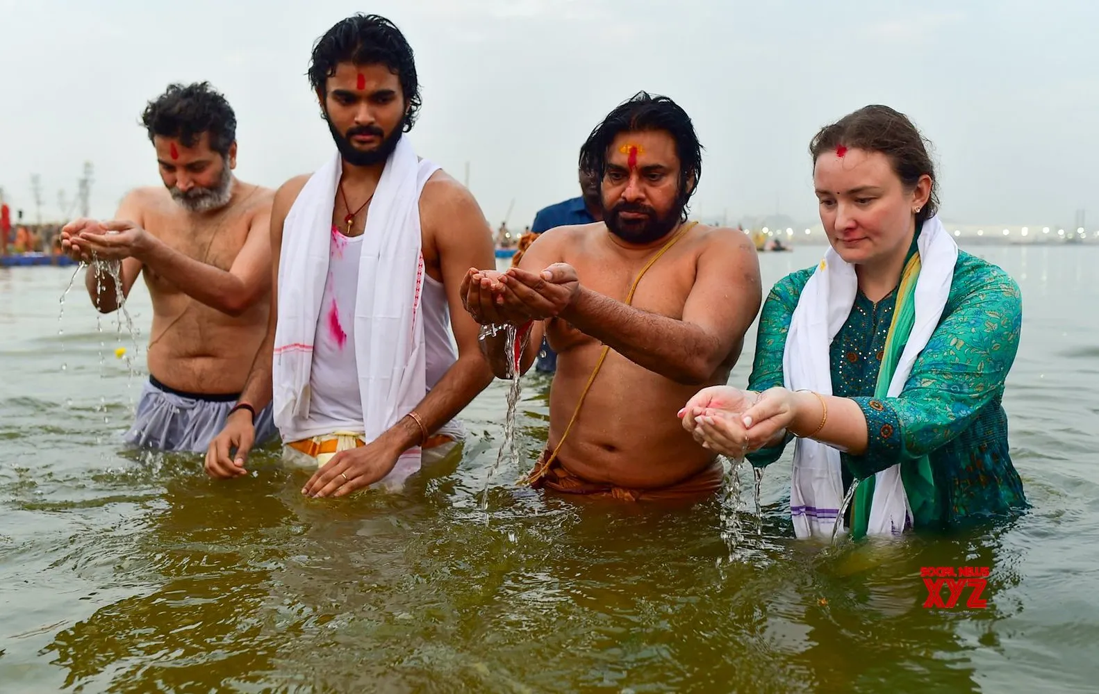 Prayagraj (UP) | Maha Kumbh Mela 2025 : Andhra Pradesh's Dy CM Pavan Kalyan along with wife Anna Lezhneva take holy dip in Triveni Sangam#Pawanakalyan #MahaKumbh2025 pic.twitter.com/VaFx3ZEoGk