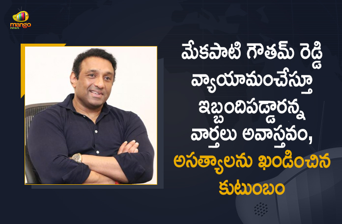 ఆంధ్రప్రదేశ్ రాష్ట్ర పరిశ్రమలు, ఐటీశాఖ మంత్రి మేకపాటి గౌతమ్ రెడ్డి(50) కన్నుమూశారు. సోమవారం ఉదయం గుండెపోటుతో ఆయన తుదిశ్వాస విడించారు. ఈ నేపథ్యంలో సోషల్ మీడియాలో వస్తున్న అసత్యాలపై స్పందిస్తూ, గౌతమ్ రెడ్డి మృతికి ముందు చోటుచేసుకున్న పరిణామాలపై మంత్రి మేకపాటి కుటుంబం ఒక ప్రకటన విడుదల చేసింది. మంత్రి మేకపాటి గౌతమ్ రెడ్డి వ్యాయామం చేస్తూ ఇబ్బందిపడ్డారన్న వార్తలు అవాస్తవమని మంత్రి కుటుంబం పేర్కొంది. ఆదివారం రాత్రి జరిగిన ఓ ఫంక్షన్ లో యథావిధిగా సంతోషంగా గడిపి రాత్రి 9.45 కల్లా మంత్రి మేకపాటి ఇంటికి చేరుకున్నారని తెలిపారు.
