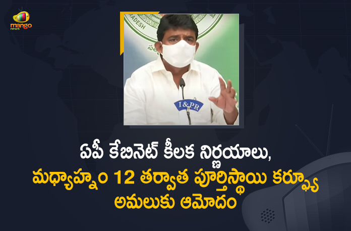 - మే 5, బుధవారం నుంచి మధ్యాహ్నం 12 గంటల తర్వాత పూర్తిస్థాయి కర్ఫ్యూ అమలుకు మంత్రి వర్గం ఆమోదం. ఉదయం 6 గంటల నుంచి మధ్యాహ్నం 12 గంటల వరకే దుకాణాలకు అనుమతి.
