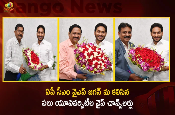 ఆంధ్రప్రదేశ్ ముఖ్యమంత్రి వైఎస్ జగన్ మోహన్ రెడ్డిని బుదవారం తాడేపల్లిలోని సీఎం క్యాంప్ కార్యాలయంలో మూడు యూనివర్సిటీల వైస్ చాన్స్లర్లు (వీసీ) కలిశారు. ఏపీలో మూడు యూనివర్శిటీలకు కొత్త వైస్ చాన్స్లర్లు నియమిస్తూ ఉన్నత విద్యాశాఖ ఇటీవలే ఉత్తర్వులు జారీ చేసిన విషయం తెలిసిందే. ఈ నేపథ్యంలో కొత్తగా నియమితులైన వైస్ చాన్స్లర్లు సీఎం వైఎస్ జగన్ తో మర్యాదపూర్వకంగా భేటీ అయ్యారు.