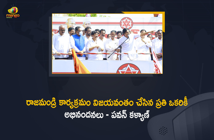 “ఎన్నో అడ్డంకులు, ఇంకెన్నో ఒత్తిళ్లు ఎదురైనా కార్యక్రమాన్ని విజయవంతం చేసిన తూర్పుగోదావరి జిల్లా అధ్యక్షులు కందుల దుర్గేష్, జిల్లాకు చెందిన పీఏసీ సభ్యులు పంతం నానాజీ, ముత్తా శశిధర్, పితాని బాలకృష్ణ, అసెంబ్లీ నియోజకవర్గ ఇంఛార్జులు శెట్టిబత్తుల రాజబాబు, మేడా గురుదత్ ప్రసాద్, వేగుళ్ల లీలాకృష్ణ, తుమ్మల బాబు, బండారు శ్రీనివాస్, పోలిశెట్టి చంద్రశేఖర్, మరెడ్డి శ్రీనివాస్, మాకినీడు శేషు కుమారి, అత్తి సత్యనారాయణ, పాటంశెట్టి సూర్యచంద్ర, వరుపుల తమ్మయ్య బాబు, పార్టీ నేతలు డి.ఎమ్.ఆర్. శేఖర్, వై.శ్రీనివాస్, రాష్ట్ర కమిటీ, జిల్లా కమిటీ సభ్యులు, పార్టీ రాష్ట్ర కార్యక్రమాల నిర్వహణ సమన్వయకర్త కళ్యాణం శివ శ్రీనివాస్ నేతృత్వంలోని కమిటీ సభ్యులకు అభినందనలు తెలియజేస్తున్నాను” అని పవన్ కళ్యాణ్ పేర్కొన్నారు.