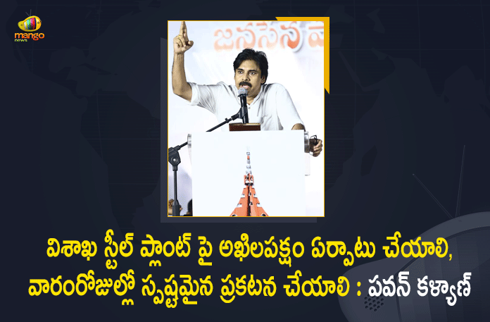 విశాఖ స్టీల్ ప్లాంట్ ను కాపాడుకోవాలంటే వైసీపీ ప్రభుత్వం అఖిలపక్షం ఏర్పాటు చేయాలని జనసేన పార్టీ అధ్యక్షుడు పవన్ కళ్యాణ్ డిమాండ్ చేశారు. వారం రోజులలోపు స్టీల్ ప్లాంట్ ని ఎలా ఆపబోతున్నారో స్పష్టమైన ప్రకటన చేసి అఖిల పక్షం ద్వారా సమస్య తీవ్రతను కేంద్రానికి తెలియచేయాలన్నారు. ఈ మేరకు ఆదివారం నాడు స్టీల్ ప్లాంట్ ప్రాంగణం నుంచి పవన్ కళ్యాణ్ పిలుపు ఇచ్చారు. ఆదివారం సాయంత్రం విశాఖ స్టీల్ ప్లాంట్ ప్రాంగణంలో నిర్వహించిన విశాఖ ఉక్కు పరిరక్షణ పోరాట కమిటీ-నిర్వాసితుల ఐక్య వేదికల ఆధ్వర్యంలో నిర్వహించిన భారీ బహిరంగ సభలో పవన్ కళ్యాణ్ పాల్గొని ప్రసంగించారు. ముందుగా విశాఖ విమానాశ్రయం నుంచి స్టీల్ ప్లాంట్ వరకూ వేలమందితో సాగిన ర్యాలీతో పవన్ కళ్యాణ్ సభా ప్రాంగణానికి చేరుకున్నారు.