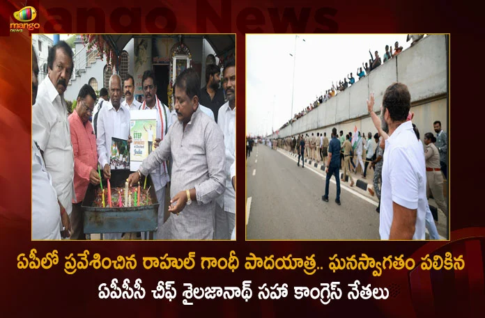 కాంగ్రెస్ అగ్రనేత రాహుల్ గాంధీ చేపట్టిన ‘భారత్ జోడో యాత్ర’ శుక్రవారం (14 అక్టోబర్, 2022) ఆంధ్రప్రదేశ్ రాష్ట్రంలోకి ప్రవేశించింది. ఈరోజు ఉదయం 7 గంటలకు కర్ణాటకలోని ఆంధ్రా సరిహద్దు జిల్లా చిత్రదుర్గ, రాంపురాలో ప్రారంభమైన ఆయన పాదయాత్ర అనంతపురం జిల్లా డి.హీరేహాళ్ వద్ద ఏపీ లోకి ప్రవేశించింది. ఈ నేపథ్యంలో ఆంధ్రప్రదేశ్ పీసీసీ అధ్యక్షుడు శైలజానాథ్, మాజీ పీసీసీ అధ్యక్షుడు రఘువీరారెడ్డి, కేంద్ర మాజీ మంత్రి జేడీ శీలం, కాంగ్రెస్ నేషనల్ కోఆర్డినేటర్ కే రాజు, ఏఐసీసీ సెక్రటరీ రుద్రరాజు, ఏపీసీసీ కిసాన్ సెల్ అధ్యక్షుడు గురునాథ్ రావు సహా పలువురు కాంగ్రెస్ నేతలు, కార్యకర్తలు రాహుల్ గాంధీకి ఘనస్వాగతం పలికారు. కాగా కొద్దిసేపు విశ్రాంతి అనంతరం పాదయాత్ర తిరిగి ప్రారంభమై అనంతపురం జిల్లాలోని ఓబులాపురం వరకు నేడు యాత్ర కొనసాగనుంది. రాత్రికి బళ్లారిలోని హలకుంది మఠ్ సమీపంలో రాహుల్ గాంధీ బస చేయనున్నారు. ఇక ఏపీలో మొత్తం 5 రోజుల పాటు రాహుల్ పాదయాత్ర కొనసాగనుంది. కాగా రాహుల్ గాంధీని చూసేందుకు ప్రజలు భారీ ఎత్తున తరలి వచ్చారు.