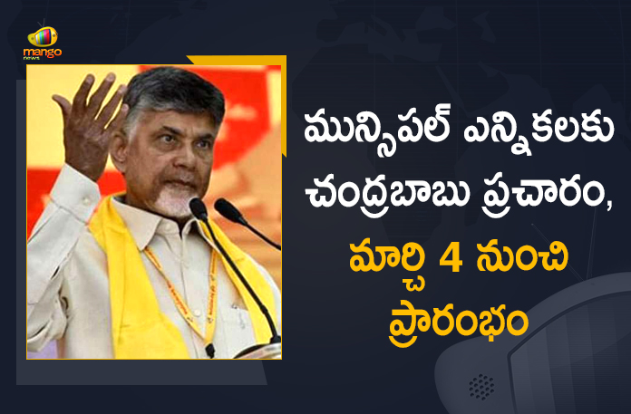 ఆంధ్రప్రదేశ్ రాష్ట్రంలో మార్చి 10 న 12 కార్పోరేషన్స్, 75 మునిసిపాలిటీలు/నగర పంచాయతీలకు ఎన్నికలు జరగనున్న సంగతి తెలిసిందే. ఈ నేపథ్యంలో టీడీపీ అధినేత చంద్రబాబు నాయుడు మున్సిపల్ ఎన్నికల కోసం ప్రచారం చేపట్టాలని నిర్ణయించారు. మార్చి 4, గురువారం నుంచి మార్చి 8, సోమవారం వరకు 5 రోజుల పాటుగా పలు జల్లాల్లో చంద్రబాబు పర్యటించి మున్సిపల్ ఎన్నికల ప్రచారం నిర్వహించనున్నారు.