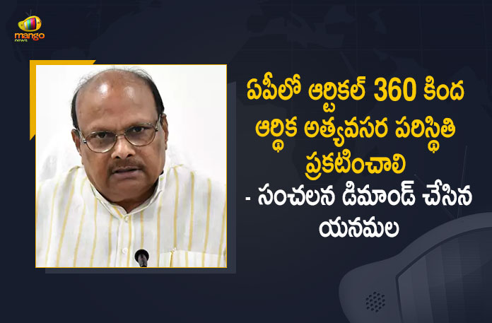 ఆంధ్రప్రదేశ్ రాష్ట్రంలో ఆర్టికల్ 360 కింద ఆర్థిక అత్యవసర పరిస్థితి ప్రకటించాలని టీడీపీ సీనియర్ నేత యనమల రామకృష్ణుడు కేంద్రాన్ని డిమాండ్ చేశారు. ఏపీ ప్రభుత్వం నియమ నిబంధనలను పాటించకుండా ఇష్టారీతిన ఆర్థిక లావాదేవిలను నిర్వహిస్తోందని, కావున దీనిపై వెంటనే కేంద్ర ప్రభుత్వం జోక్యం చేసుకోవాలని ఆయన కోరారు. ఈ రోజు మీడియా సమావేశంలో యనమల మాట్లాడుతూ.. వైసీపీ ప్రభుత్వం గత సంవత్సరపు బడ్జెట్లో రూ.1.78 లక్షల కోట్లు ఖర్చుపెట్టినట్లు చూపించిందని, కానీ దీనిలో రూ.48 వేల కోట్ల పైగా లెక్కలు చెప్పడం లేదని స్వయంగా కాగ్ పేర్కొందని తెలిపారు. అయితే ఏపీ ప్రభుత్వం మాత్రం దీనిపై అసత్యాలు చెప్తోందని, స్పెషల్ బిల్లుల పేరుతో ఖర్చుపెట్టామంటున్నారని వెంటనే కేంద్రం ఈ తప్పుడు లెక్కలపై సీబీఐతో విచారణ జరిపించాలని డిమాండ్ చేశారు.