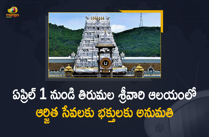 తిరుమల తిరుపతి దేవస్థానం (టీటీడీ) భక్తులకు శుభవార్త చెప్పింది. తిరుమల శ్రీవారి ఆలయంలో ఏప్రిల్ 1వ తేదీ నుండి ఆర్జిత సేవలు తిరిగి ప్రారంభించి భక్తులను అనుమతించాలని నిర్ణయించారు. ఈ మేరకు టీటీడీ సోమవారం నాడు ఒక ప్రకటన విడుదల చేసింది. సుప్రభాతం, తోమాల, అర్చన, అష్టదళపాదపద్మారాధన, తిరుప్పావడ, మేల్చాట్ వస్త్రం, అభిషేకం, కల్యాణోత్సవం, డోలోత్సవం, ఆర్జిత బ్రహ్మోత్సవం, సహస్రదీపాలంకార సేవలు నిర్వహిస్తారు. అయితే కోవిడ్-19 పరిస్థితుల ముందున్న విధానంలోనే ఆర్జిత సేవా టికెట్ల బుకింగ్ కొనసాగుతుందని తెలిపారు.