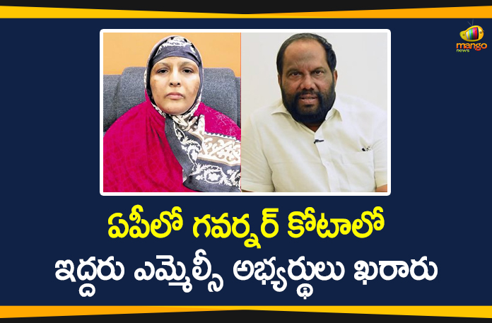 ఆంధ్రప్రదేశ్ రాష్ట్రంలో గవర్నర్ నామినేటెడ్ కోటాలో ఖాళీగా ఉన్న రెండు ఎమ్మెల్సీ స్థానాలకు ఇద్దరి పేర్లను సీఎం వైఎస్ జగన్ మోహన్ రెడ్డి ఖరారు చేశారు. తూర్పు గోదావరి జిల్లాలో ఎస్సీ వర్గానికి చెందిన అమలాపురం మాజీ ఎంపీ పండుల రవీంద్రబాబు, వైఎస్ఆర్(కడప) జిల్లా రాయచోటికి చెందిన మైనారిటీ మహిళా నేత జకియా ఖానమ్ లను ఎమ్మెల్సీ అభ్యర్థులుగా నిర్ణయించారు. అనంతరం వారిద్దరి పేర్లను రాష్ట్ర ప్రభుత్వం గవర్నర్ బిశ్వభూషణ్ హరి చందన్ కు సమర్పించింది.