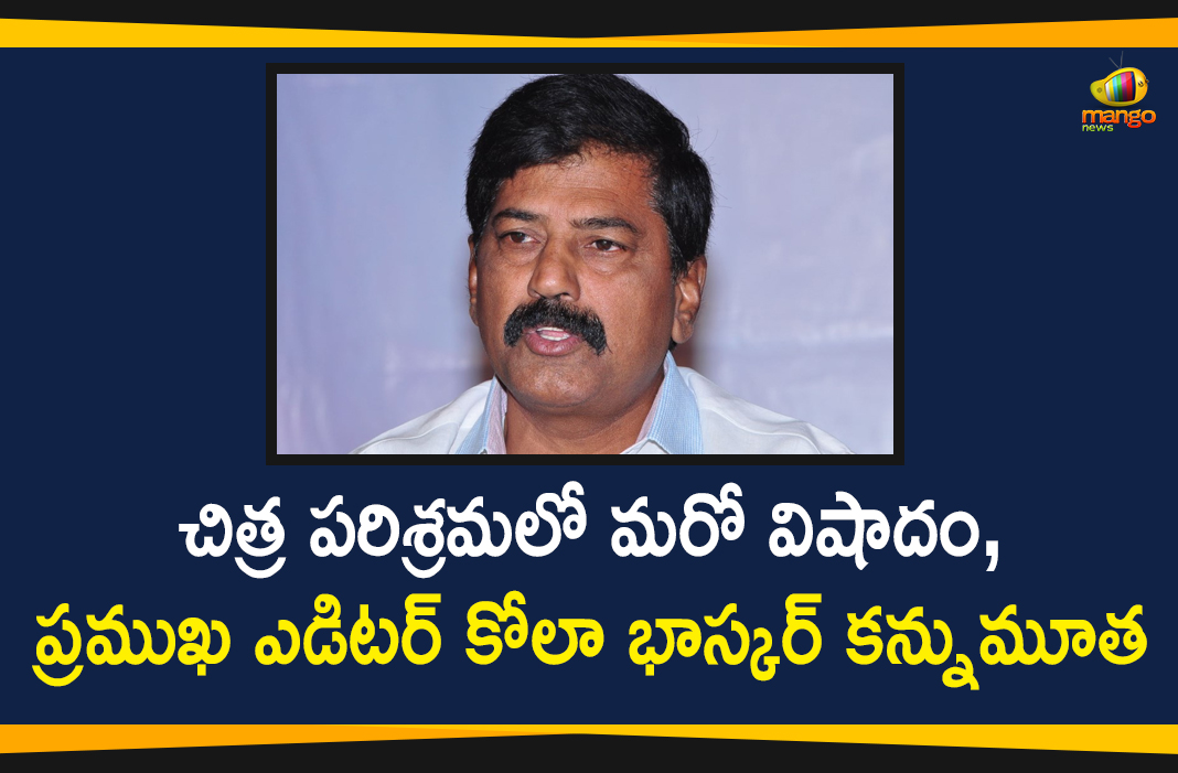 తెలుగు చిత్ర పరిశ్రమలో మరో విషాదం చోటు చేసుకుంది. ప్రముఖ ఎడిటర్ కోలా భాస్కర్ కన్నుమూశారు. ఆయన వయసు 55 సంవత్సరాలు. గత కొంతకాలంగా గొంతు క్యాన్సర్తో బాధపడుతున్న ఆయన హైదరాబాద్ లోని ఓ ఆసుపత్రిలో చికిత్స పొందుతున్నారు. ఈ క్రమంలో పరిస్థితి విషమించడంతో బుధవారం ఉదయం తుది శ్వాస విడిచారు. తెలుగు, తమిళ భాషల్లో పలు చిత్రాలకు ఎడిటర్గా కోలా భాస్కర్ పనిచేశారు. ఖుషి, 7/జీ బృందావన్ కాలనీ, ఆడవారి మాటలకు అర్ధాలే వేరులే, 3, యుగానికి ఒక్కడు, వర్ణ, పొక్కిరి చిత్రాలకు ఎడిటర్గా మంచిపేరు సంపాదించారు. అలాగే తన కుమారుడు బాలకృష్ణ హీరోగా నిన్ను వదిలి నేను పోలేనులే అనే చిత్రాన్ని కూడా నిర్మించారు. కోలా భాస్కర్ మృతి పట్ల తెలుగు, తమిళ సినీ రంగాలకు చెందిన పలువురు ప్రముఖులు సంతాపం వ్యక్తం చేశారు.