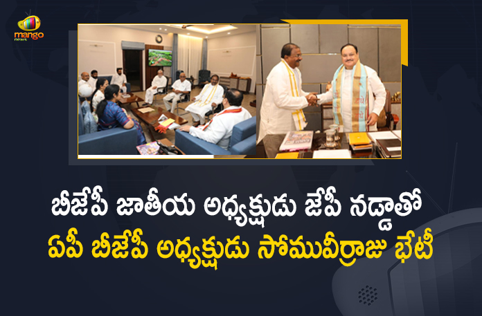 ఆంధ్రప్రదేశ్ రాష్ట్ర బీజేపీ అధ్యక్షుడు సోమువీర్రాజు బుధవారం ఉదయం ఢిల్లీలో బీజేపీ జాతీయ అధ్యక్షుడు జేపీ నడ్డాతో సమావేశం అయ్యారు. ఈ సందర్భంగా ఆంధప్రదేశ్ రాష్ట్రంలో ప్రస్తుత రాజకీయ పరిస్థితులు, పార్టీపరంగా చేపడుతున్న వివిధ కార్యక్రమాలు, భవిష్యత్ కార్యాచరణకు సంబంధించిన పలు అంశాలపై చర్చించడం జరిగిందని సోమువీర్రాజు పేర్కొన్నారు. ఈ సమావేశంలో ఏపీ బీజేపీ నేత, పార్టీ జాతీయ ప్రధాన కార్యదర్శి పురందేశ్వరి, బీజేపీ జాతీయ ప్రధాన కార్యదర్శి (ఆర్గ్) బీఎల్ సంతోష్ సహా పలువురు నాయకులు పాల్గొన్నారు. గత కొన్ని రోజులుగా ఏపీలో చోటు చేసుకుంటున్న రాజకీయ పరిణామాలు, వచ్చే ఎన్నికల్లో పొత్తులపై ఊహాగానాలు సహా పలు ఇతర అంశాల నేపథ్యంలో పార్టీ అధ్యక్షుడు జేపీ నడ్డాతో సోమువీర్రాజు తాజాగా భేటీ కావడం ప్రాధాన్యత సంతరించుకుంది.