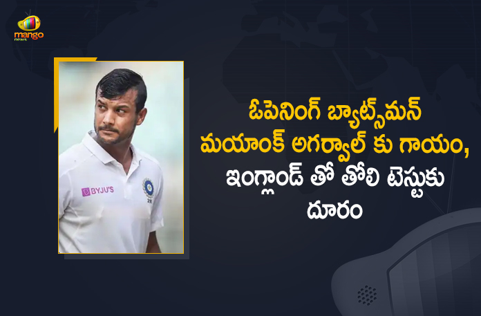 భారత్ క్రికెట్ జట్టు ఇంగ్లాండ్ లో పర్యటిస్తున్న విషయం తెలిసిందే. ఈ నేపథ్యంలో భారత్ జట్టు ఓపెనింగ్ బ్యాట్స్మన్ మయాంక్ అగర్వాల్ గాయపడ్డాడు. సోమవారం నాడు నాటింగ్హామ్లోని ట్రెంట్ బ్రిడ్జ్లో భారత నెట్స్ సెషన్లో బ్యాటింగ్ చేస్తున్నప్పుడు మయాంక్ అగర్వాల్ హెల్మెట్ కు బంతి తగలడంతో గాయపడ్డాడు. బీసీసీఐ మెడికల్ టీమ్ అతడి పరిస్థితిని అంచనా వేసిందని మరియు కంకషన్ టెస్ట్ నిర్వహించబడిందని చెప్పారు. అతను కంకషన్ సంకేతాలను చూపించడంతో ఇంగ్లాండ్ తో తోలి టెస్టుకు దూరమయ్యాడని బీసీసీఐ ప్రకటించింది. 30 ఏళ్ల మయాంక్ అగర్వాల్ ఆరోగ్యం స్థిరంగా ఉందని మరియు వైద్యుల పర్యవేక్షణలో ఉన్నాడని తెలిపారు. మరోవైపు ఆగస్టు 4 నుంచి భారత్, ఇంగ్లాండ్ జట్ల మధ్య తోలి టెస్టు జరగనుంది. ఈ పర్యటనలో ఇంగ్లాండ్ తో భారత్ జట్టు మొత్తం 5 టెస్టులు ఆడనుంది.