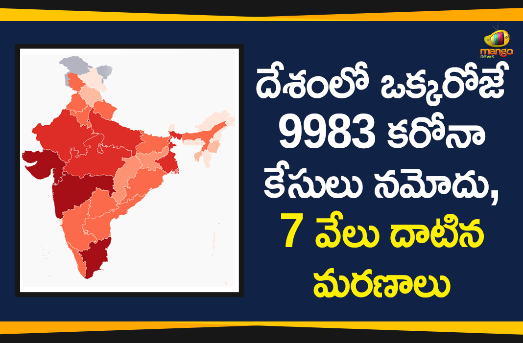 భారత్ లో కోవిడ్-19(కరోనా వైరస్) మహమ్మారి విజృంభణ కొనసాగుతుంది. దీంతో గత ఐదు రోజులుగా ప్రతిరోజూ 9వేలకు పైగా కరోనా పాజిటివ్ కేసులు నమోదవుతున్నాయి. గత 24 గంటల్లోనే దేశవ్యాప్తంగా కొత్తగా 9,983 కరోనా పాజిటివ్ కేసులు, 206 కరోనా మరణాలు నమోదయ్యాయి. దేశంలో కరోనా వ్యాప్తి చెందడం మొదలయ్యాక అత్యధికంగా ఒకేరోజున ఈ స్థాయిలో కేసులు నమోదవడం ఇదే తొలిసారి. జూన్ 8, సోమవారం ఉదయానికి దేశంలో మొత్తం కరోనా బాధితుల సంఖ్య 2,56,611 కు పెరిగిందని కేంద్ర ఆరోగ్య, కుటుంబ సంక్షేమ మంత్రిత్వ శాఖ వెల్లడించింది.