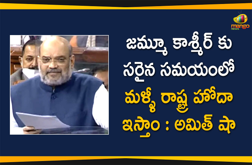 లోక్సభలో శనివారం నాడు జమ్మూ కాశ్మీర్ పునర్వ్యవస్థీకరణ (సవరణ) బిల్లు ఆమోదం పొందింది. ముందుగా సభలో ఈ బిల్లుపై చర్చ సందర్భంగా కేంద్ర హోంమంత్రి అమిత్ షా కీలక ప్రసంగం చేశారు. ఈ సవరణ బిల్లుకు జమ్మూ కాశ్మీర్ రాష్ట్ర హోదాకు ఎలాంటి సంబంధం లేదని చెప్పారు. జమ్మూ కాశ్మీర్ కు సరైన సమయంలో తిరిగి మళ్ళీ రాష్ట్ర హోదా ఇస్తామని ప్రకటించారు. గతంలో కూడా ఇదే విషయాన్ని సభలో వెల్లడించామని చెప్పారు. రాష్ట్ర హోదా ఇవ్వబోమని ఈ బిల్లులో ఎక్కడా లేదని, ప్రతిపక్షాలు అనవసర రాద్ధాంతం చేస్తున్నాయని విమర్శించారు.