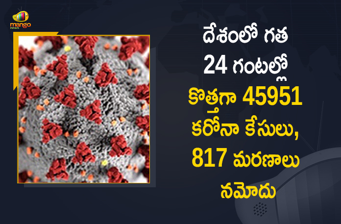 దేశంలో గత 24 గంటల్లో కొత్తగా 45,951 కరోనా పాజిటివ్ కేసులు నమోదవడంతో మొత్తం కేసుల సంఖ్య 3,03,62,848 కు చేరుకుంది. అలాగే కరోనాతో మరో 817 మంది మరణించినట్టు తెలిపారు. దీంతో దేశంలో మొత్తం మరణాల సంఖ్య 3,98,454 కు చేరుకుంది. ముఖ్యంగా కేరళ, మహారాష్ట్ర, తమిళనాడు, ఆంధ్రప్రదేశ్, కర్ణాటక, అస్సాం, ఒడిశా, వెస్ట్ బెంగాల్, తెలంగాణ, ఛత్తీస్ గడ్ వంటి 10 రాష్ట్రాల్లోనే గత 24 గంటల్లో కొత్త కేసులు ఎక్కువుగా నమోదు అయ్యాయి. ఇక దేశంలో ప్రస్తుతం 5,37,064 (1.77%) యాక్టీవ్ కేసులు ఉన్నాయి. మరో 60,729 మంది కరోనా నుంచి కోలుకోవడంతో, మొత్తం రికవరీల సంఖ్య 2,94,27,330 కు చేరుకుంది. కరోనా రికవరీ రేటు 96.92 శాతంగా ఉండగా, మరణాల రేటు 1.31 శాతంగా నమోదైంది.