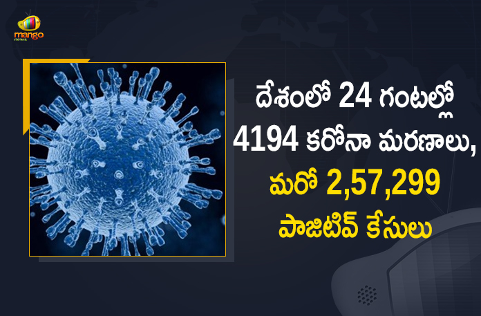 దేశంలో కరోనా ఉధృతి కొద్దిగా తగ్గుముఖం పట్టింది. రోజువారీగా నమోదయ్యే కొత్త కరోనా కేసులు వరుసగా ఆరోరోజూ కూడా 3 లక్షల కన్నా తక్కువగా నమోదయ్యాయి. అయితే కరోనా మరణాలు మాత్రం పెద్ద సంఖ్యలోనే నమోదవుతున్నాయి. గత 24 గంటల్లో కొత్తగా 2,57,299 కేసులు, 4194 మరణాలు నమోదవడంతో మొత్తం కరోనా కేసుల సంఖ్య 2,62,89,290 కు చేరుకోగా, మరణాల సంఖ్య 2,95,525 కి పెరిగింది. కొత్తగా నమోదైన కేసుల్లో తమిళనాడు, కర్ణాటక, కేరళ, మహారాష్ట్ర, ఆంధ్రప్రదేశ్, వెస్ట్ బెంగాల్, ఒడిశా, ఉత్తర్ ప్రదేశ్, రాజస్థాన్, అస్సాం వంటి 10 రాష్ట్రాల్లోనే 78.12 శాతం కేసులు నమోదు అయ్యాయి. దేశంలో ప్రస్తుతం 29,23,400 (11.12%) యాక్టీవ్ కేసులు ఉన్నాయి. మరో 3,57,630 మంది కరోనా నుంచి కోలుకోవడంతో, మొత్తం రికవరీల సంఖ్య 2,30,70,365 కు చేరుకుంది. కరోనా రికవరీ రేటు 87.76 శాతంగా ఉండగా, మరణాల రేటు 1.12 శాతంగా నమోదైంది.