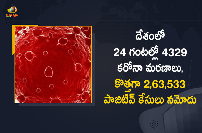 దేశంలో కరోనా మహమ్మారి తీవ్రత కొనసాగుతుంది. కొత్తగా 2,63,533 కరోనా కేసులు నమోదవడంతో మే 18, మంగళవారం ఉదయం 8 గంటల వరకు మొత్తం పాజిటివ్ కేసుల సంఖ్య 2,52,28,996 చేరుకుంది. అలాగే కరోనాకు చికిత్స పొందుతూ మరో 4,329 మంది మరణించడంతో మొత్తం మరణాల సంఖ్య 2,78,719 కి పెరిగింది. దేశంలో ఇప్పటివరకు ఒకరోజు వ్యవధిలో ఈ స్థాయిలో (4,329) కరోనా మరణాలు చోటుచేసుకోవడం ఇదే తొలిసారి. మరోవైపు ప్రపంచవ్యాప్తంగా అత్యధిక కరోనా కేసులు నమోదైన దేశాల్లో రెండో స్థానంలో, అత్యధిక మరణాలు నమోదైన దేశాల్లో మూడో స్థానంలో భారత్ కొనసాగుతుంది.