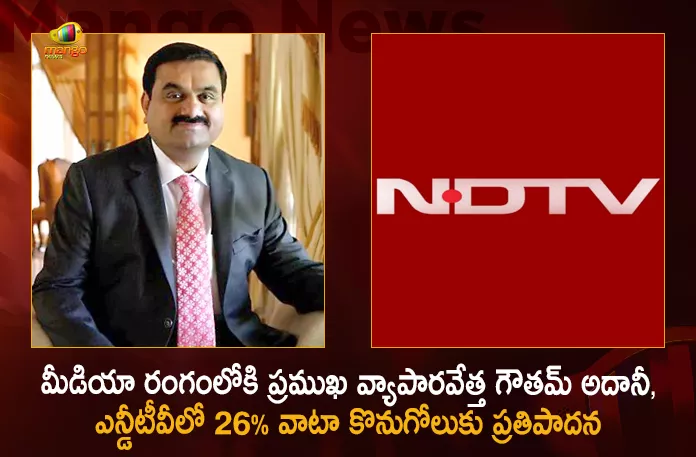 భారతీయ దిగ్గజ వ్యాపారవేత్త గౌతమ్ అదానీ తన వ్యాపార విస్తరణలో భాగంగా మీడియా రంగంలోకి ఎంటర్ అవుతున్నారు. ఈ మేరకు ఆయన దేశంలోని అత్యంత ప్రజాదరణ పొందిన వార్తా ఛానెల్లలో ఒకటైన న్యూ ఢిల్లీ టెలివిజన్ లిమిటెడ్ (ఎన్డీటీవీ) సంస్థలో పెద్ద మొత్తంలో పెట్టుబడులు పెట్టనున్నారు.ఈ క్రమంలో అదానీ గ్రూప్నకు చెందిన ఏఎమ్ఎన్ఎల్.. ఎన్డీటీవీ బ్రాడ్కాస్టర్లో రూ.493 కోట్లతో 26 శాతం వాటాలు కొనుగోలు చేసేందుకు ప్రతిపాదనలు పంపింది. అదానీ గ్రూప్నకు చెందిన ‘విశ్వప్రధాన్ కమర్షియల్ ప్రైవేట్ లిమిటెడ్’ సంస్థ ఇప్పటికే ఎన్డీటీవీ ప్రమోటర్ సంస్థ అయిన ‘ఆర్ఆర్పీఆర్ హోల్డింగ్ ప్రైవేట్ లిమిటెడ్’లో 29.18 శాతం వాటాలు కొనుగోలు చేసేందుకు సిద్దమైనట్లు తెలుస్తోంది. ప్రస్తుతం స్టాక్ మార్కెట్లలో రూ.366.20గా ఎన్డీటీవీ షేర్ విలువ ఉండగా, సంస్థకు చెందిన 1,67, 62,530 షేర్లను ఒక్కోటి రూ.294 చొప్పున కొనుగోలు చేస్తామని అదానీ గ్రూప్ ప్రతిపాదించింది.