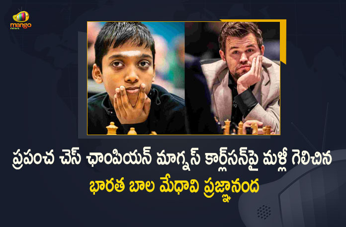 భారత బాల మేధావి, భారత గ్రాండ్మాస్టర్ ఆర్. ప్రజ్ఞానంద మరోసారి అద్భుతం చేశాడు. ప్రపంచ చెస్ ఛాంపియన్, నార్వే ప్లేయర్ మాగ్నస్ కార్ల్సన్ను వరుసగా రెండోసారి ఓడించి 16 ఏళ్ల ప్రజ్ఞానంద సంచలనం సృష్టించాడు. ప్రస్తుతం జరుగుతున్న చెస్బుల్ మాస్టర్స్ ఆన్లైన్ ర్యాపిడ్ చెస్ టోర్నమెంట్లో ఐదవ రౌండ్లో ప్రజ్ఞానంద శుక్రవారం ప్రపంచ ఛాంపియన్ మాగ్నస్ కార్ల్సెన్ను ఓడించాడు. చెస్బుల్ మాస్టర్స్ అనేది 16 మంది ఆటగాళ్ల మధ్య నిర్వహించే ఆన్లైన్ రాపిడ్ చెస్ పోటీ. మూడు నెలల వ్యవధిలో ప్రజ్ఞానానంద నార్వేజియన్ను ఓడించడం ఇది రెండోసారి కావడం గమనార్హం.