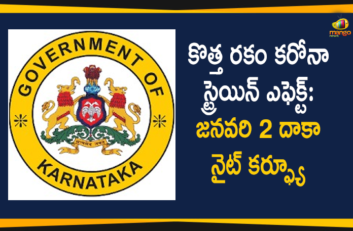 యునైటెడ్ కింగ్ డమ్ లో కొత్త రకం కరోనా వైరస్‌ స్ట్రెయిన్‌ వెలుగులోకి రావడంతో దేశంలో పలు రాష్ట్రాలు అప్రమత్తమై ముందస్తు చర్యలు తీసుకుంటున్నాయి. కేంద్రప్రభుత్వం ఆదేశాల మేరకు యూకే నుంచి వచ్చిన ప్రయాణికులకు ఆర్టీ-పీసీఆర్ కరోనా పరీక్షలు నిర్వహించడంతో పాటుగా ప్రత్యేక మార్గదర్శకాలను అమలు చేస్తున్నారు. ఈ నేపథ్యంలో కర్ణాటక రాష్ట్ర ప్రభుత్వం మరో కీలక నిర్ణయం తీసుకుంది. డిసెంబర్ 23, బుధవారం నుంచి జనవరి 2, శనివారం వరకు రాష్ట్రంలో రాత్రి 10 గంటల నుంచి ఉదయం 6 గంటల మధ్య రాత్రిపూట కర్ఫ్యూ విధిస్తున్నట్టు ప్రకటించింది.