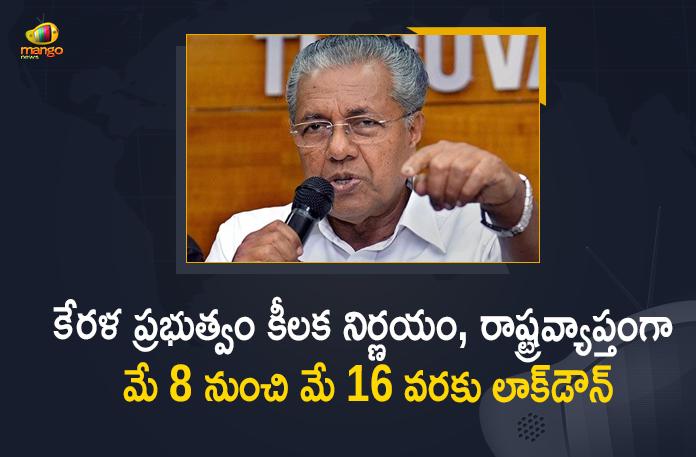 కేరళ రాష్ట్రంలో కరోనా మహమ్మారి విజృంభిస్తుంది. బుధవారం నాడు ఒక్కరోజే 41,953 పాజిటివ్ కేసులు నమోదయ్యాయి. రోజువారీగా కరోనా కేసులు భారీ సంఖ్యలో నమోదవుతుండటంతో కేరళ ప్రభుత్వం కీలక నిర్ణయం తీసుకుంది. మే 8వ తేది నుంచి మే 16 వరకు లాక్డౌన్ విధిస్తున్నట్లు కేరళ సీఎం పినరయి విజయన్ ప్రకటించారు. “కేరళ రాష్ట్రం మొత్తం మే 8 ఉదయం 6 గంటల నుండి మే 16 వరకు లాక్డౌన్ లో ఉంటుంది. బలమైన కరోనా సెకండ్ వేవ్ నేపథ్యంలో ఈ నిర్ణయం తీసుకోబడింది” సీఎం పినరయి విజయన్ పేర్కొన్నారు.