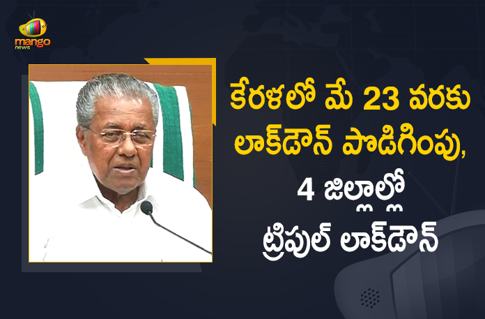 కేరళ రాష్ట్రంలో కరోనా మహమ్మారి విజృంభణ కొనసాగుతుంది. ఈ నేపథ్యంలో రాష్ట్రంలో ఇప్పటికే అమల్లో ఉన్న లాక్డౌన్ ను పొడిగిస్తూ కేరళ ప్రభుత్వం కీలక నిర్ణయం తీసుకుంది. ముందుగా మే 8వ తేది నుంచి మే 16 వరకు పూర్తిస్థాయి లాక్డౌన్ విధించారు, అయితే కరోనా పాజిటివిటీ రేటు ఎక్కువగా నమోదవుతుండడంతో లాక్డౌన్ ను మే 23 వరకు పొడిగించాలని నిర్ణయం తీసుకున్నట్టు కేరళ ముఖ్యమంత్రి పినరయి విజయన్ శుక్రవారం నాడు ప్రకటించారు. అలాగే కరోనా పరీక్షల్లో అత్యధికంగా పాజిటివిటీ రేటు నమోదవుతున్న తిరువనంతపురం, ఎర్నాకుళం, త్రిస్సూర్, మలప్పురం వంటి నాలుగు జిల్లాల్లో ట్రిపుల్ లాక్డౌన్ విధించనున్నట్టు పేర్కొన్నారు.